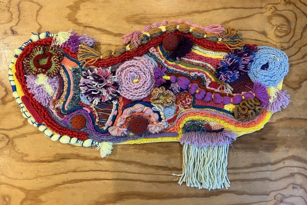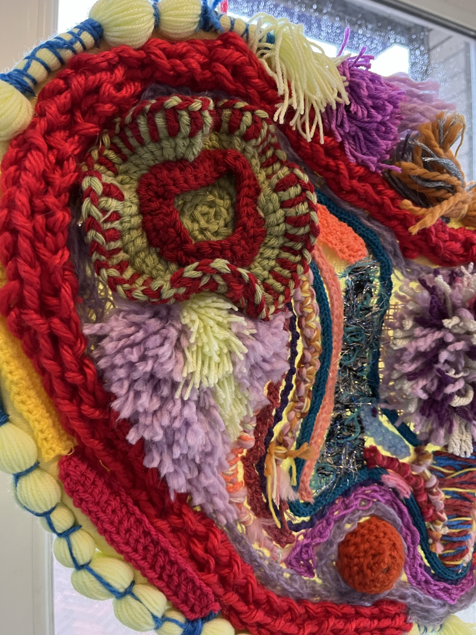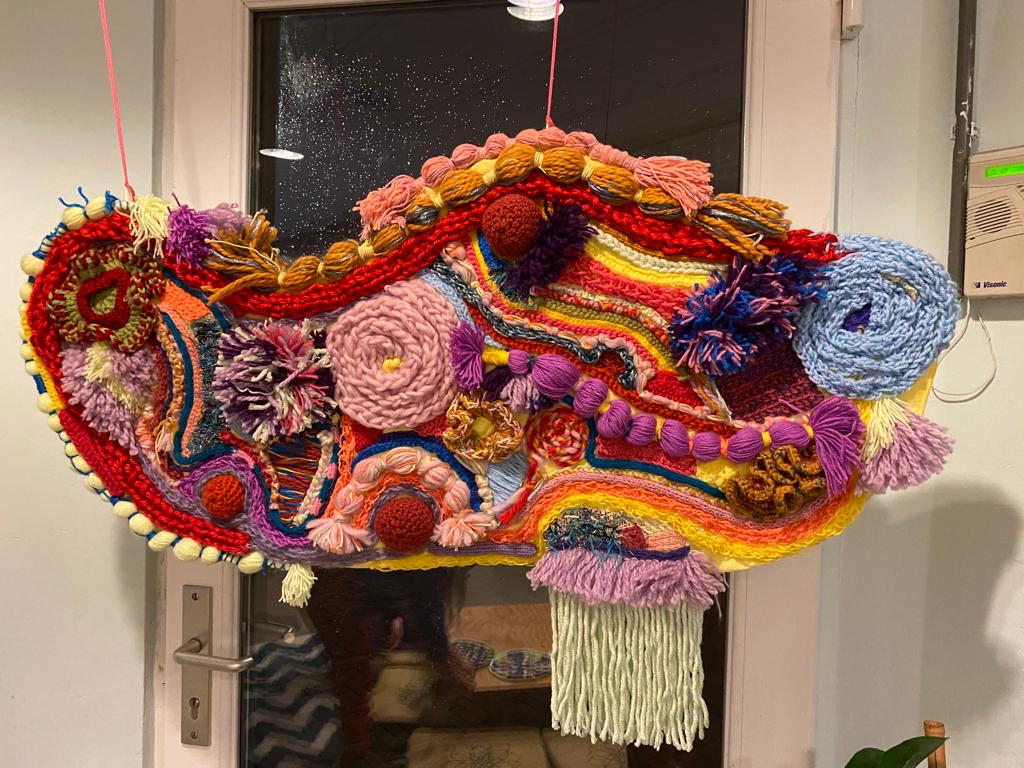 This work is made of handmade bits and pieces of my 14 birthday guests. I decided to teach all my friends different yarn techniques in one afternoon as a way to celebrate my birthday. So afterwards I would have all the handmade pieces and I would be able to play and combine everything to make a colorful artwork. It worked! I call it Celebration for the obvious reason of it being made in a birthday gathering, but also to celebrate the wholesome feeling of a community making something together. I am glad my own community of friends now got a chance to experience this feeling as well. So shout out for everyone who participated in this piece: thanks Bruno, Dymphy, Erik, Esther, Harumi, Helene, Jacqueline, LJ, Lynn, Loek, Lieke, my mom, Nine and Yumi.