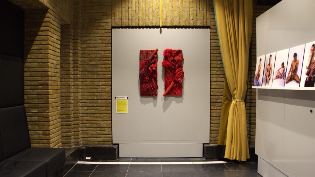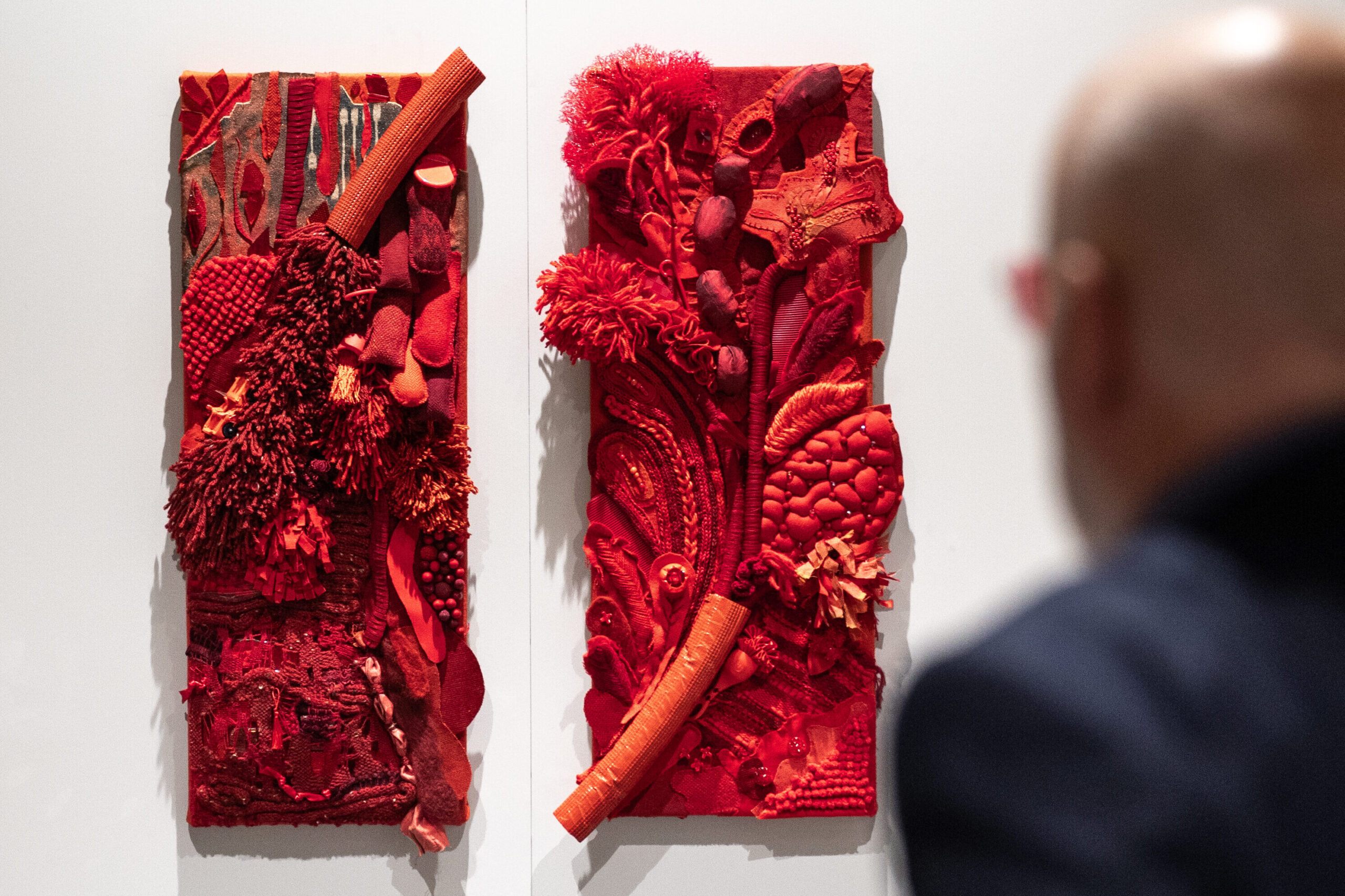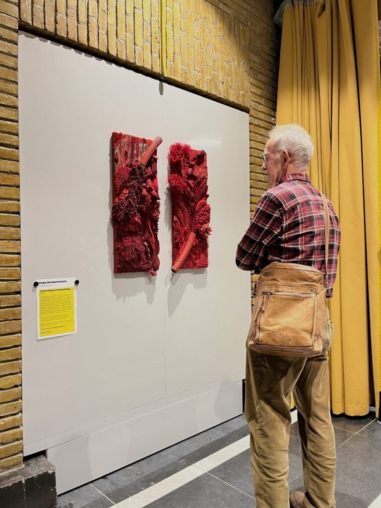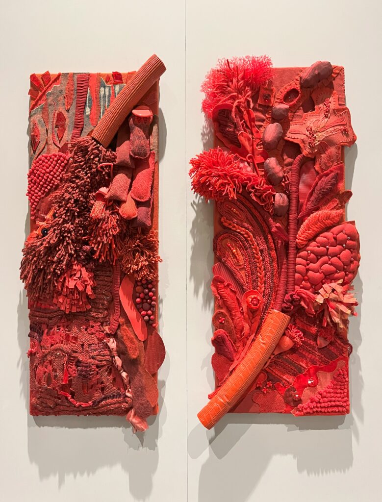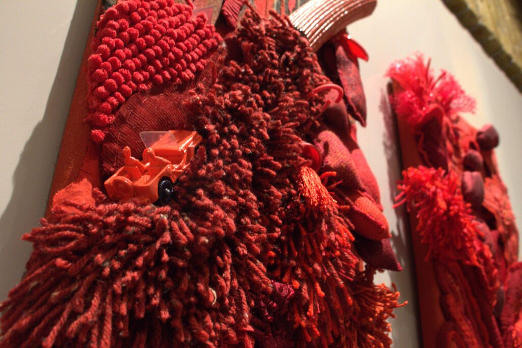 Materiaal: o.a. op straat gevonden rode dingen, acryl, wol, polyester, plastic kralen, katoengaren, variatie van tweedehands textiel en een stuk vilten rode loper.
