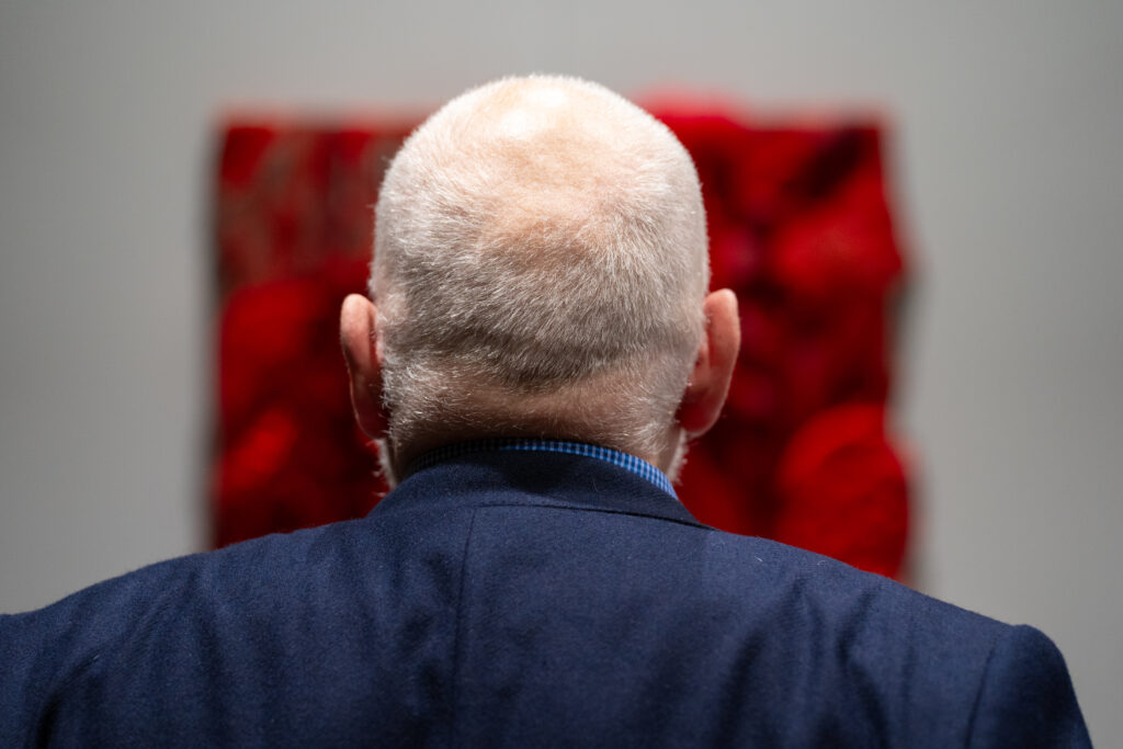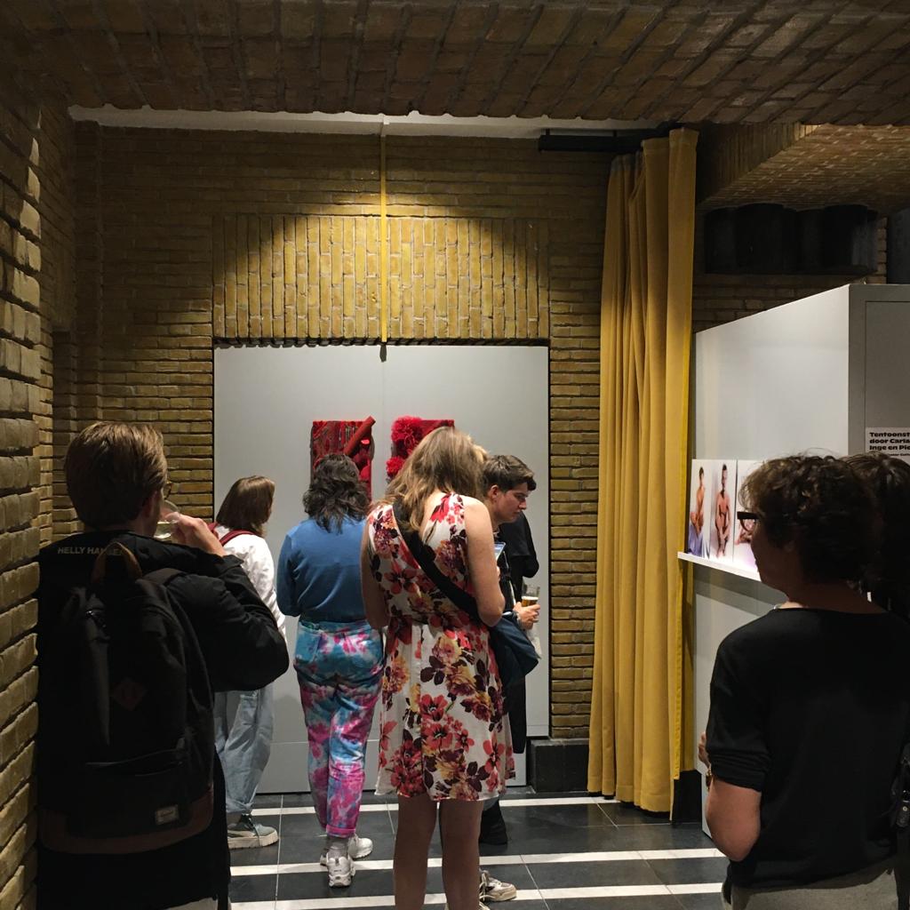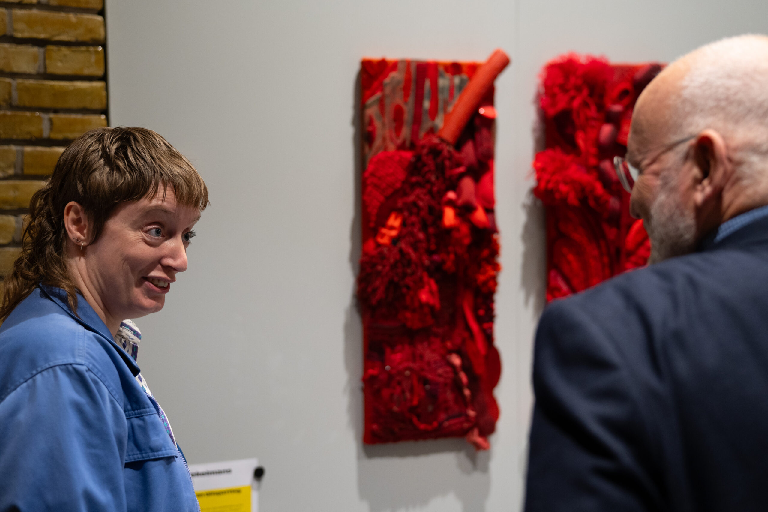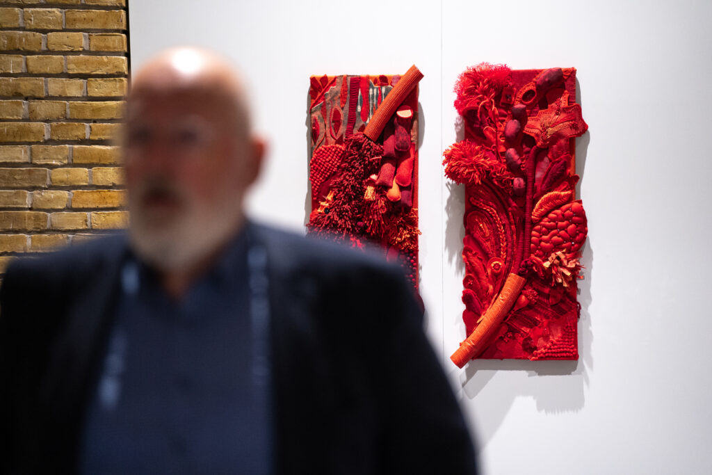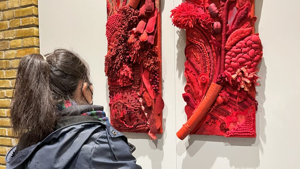 Materiaal: o.a. op straat gevonden rode dingen, acryl, wol, polyester, plastic kralen, katoengaren, variatie van tweedehands textiel en een stuk vilten rode loper.