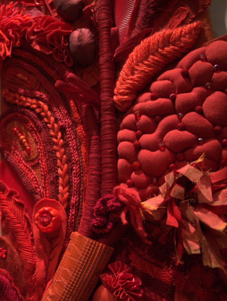Used materials: found red things on the street, acrylics, wool, cotton, polyester, plastic beads, cotton thread, variety of second hand fabrics and a piece of found red carpet.