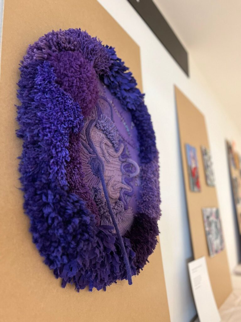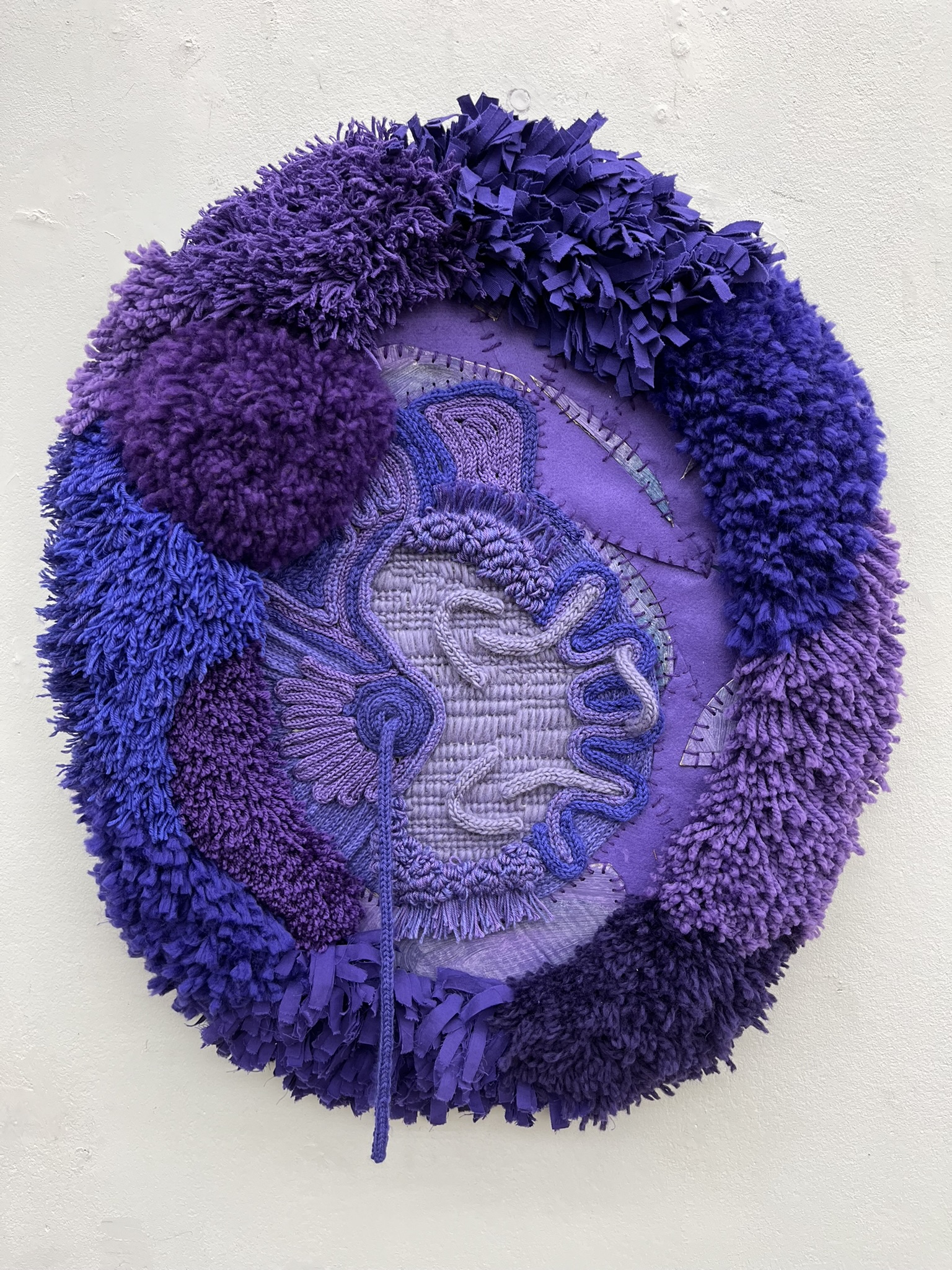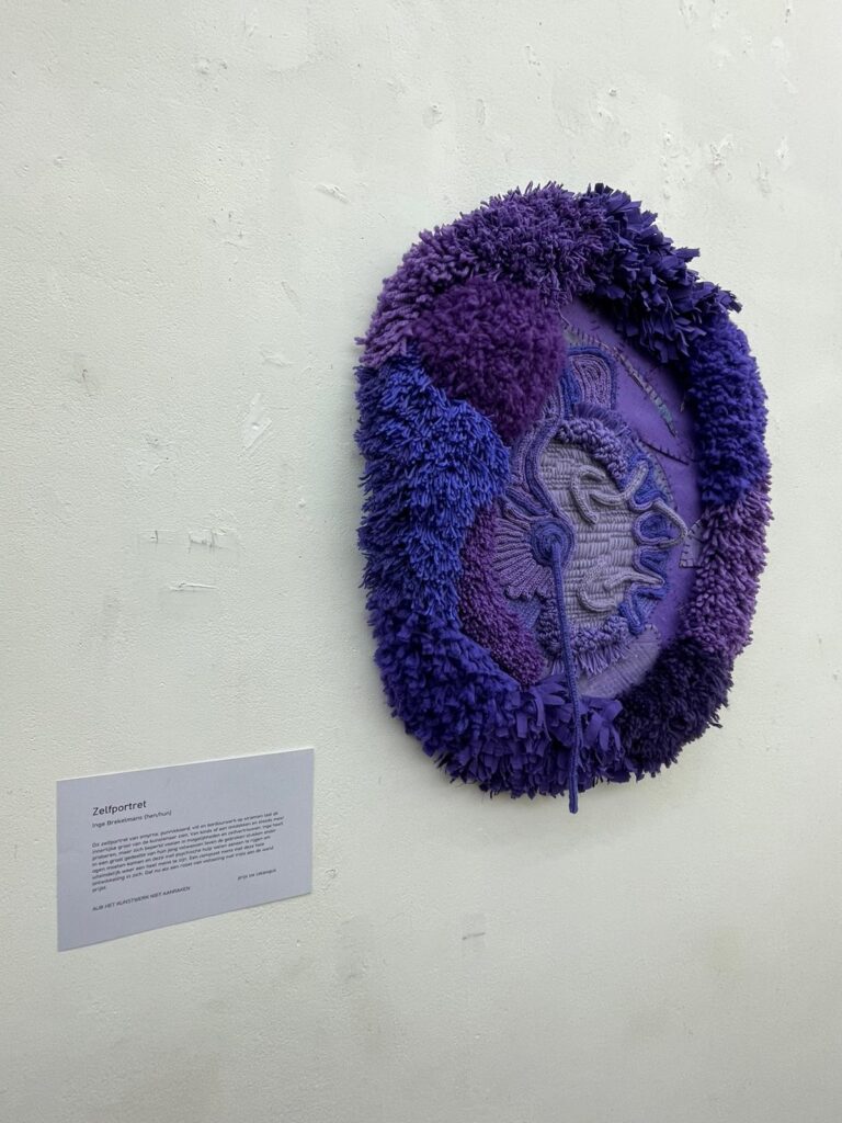 Dit zelfportret van smyrna, punnikkoord, vilt en borduurwerk op stramien laat de innerlijke groei van de kunstenaar zien. Van kinds af aan ontdekken en steeds meer proberen, maar zich beperkt voelen in mogelijkheden en zelfvertrouwen. Inge heeft in een groot gedeelte van hun jong volwassen leven de gebroken stukken onder ogen moeten komen en deze met psychische hulp weten aaneen te rijgen om uiteindelijk weer een heel mens te zijn. Een compleet mens met deze hele ontwikkeling in zich. Dat nu als een rozet van voltooiing met trots aan de wand prijkt.